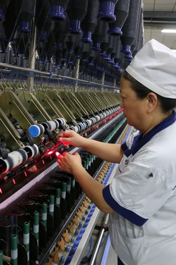 圖為恒新后紡車間主任范惠英正在檢驗(yàn)激光燈照射效果。